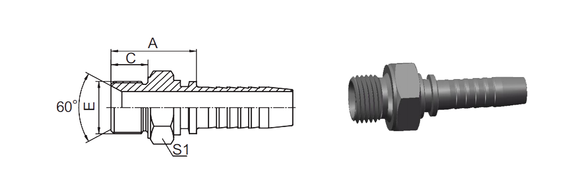 Hogar / Producto / Montaje de manguera estándar / Ajuste métrico estándar / 10611 Uso doble métrico masculino para asiento cónico de 60° o sello adherido